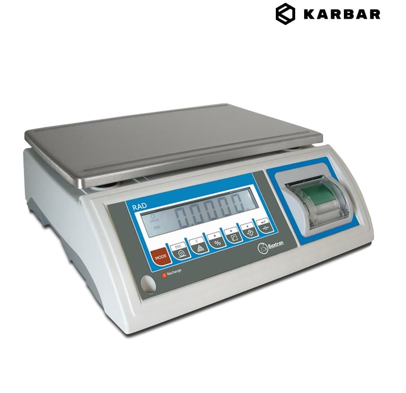 Báscula RAD 6-30kg con impresora incorporada y pantalla LCD retroiluminada con 5 dígitos. La báscula dispone de 7 teclas, además, está disponible en 6kg, 15kg o 30kg. Igualmente, es válida para metrología legal y está fabricada con la carcasa en ABS y el plato en acero inoxidable. Asimismo, cuenta con protección IP44, protección contra sobrecargas y la temperatura de funcionamiento es de 0º y hasta 40ºC. También dispone de 4 pies regulables en altura y nivel burbuja. Además, la Báscula RAD 6-30kg cuenta con batería interna recargable. También cuenta con las siguientes funciones: Acumulación, Cero, Tara, Bruto/Neto, Cuenta piezas, Función de límites y Filtro de animales en movimiento.